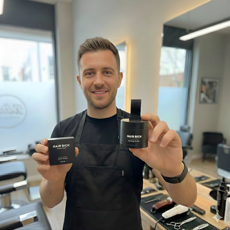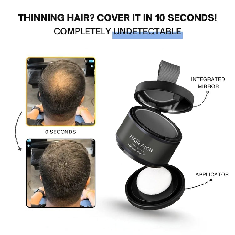 HAIR RICH is an advanced hair camouflage powder that magnetically binds to every hair strand, even the tiniest, invisible ones—to instantly cover thinning or balding areas. In just 10 seconds, regain natural-looking hair density without surgery, long treatments, or messy sprays.