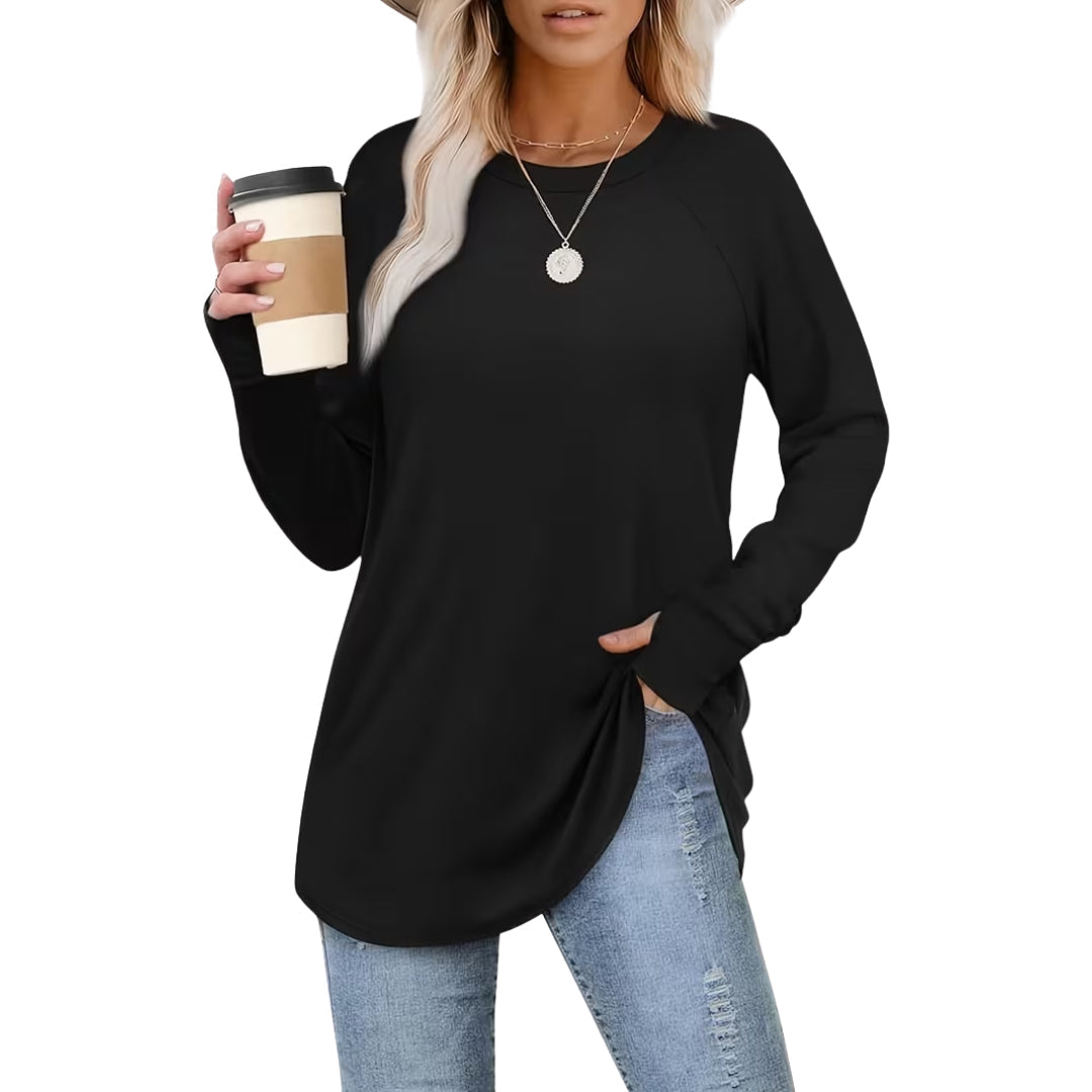 Toni™ er en langermet tunika for kvinner med klassisk rund hals, trendy avrundet kant og søte tommelhull – perfekt for lag-på-lag-bruk om høsten og vinteren.